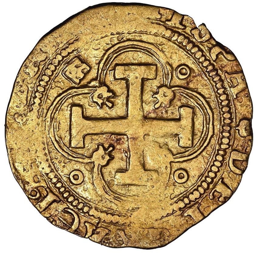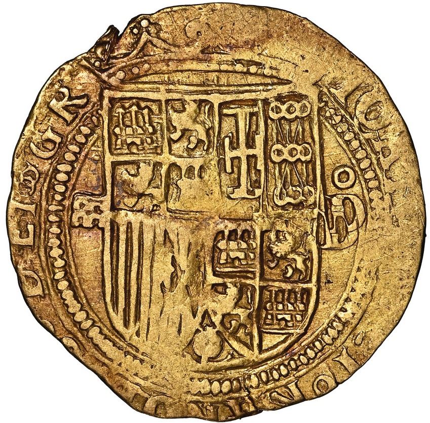 Segovia, Spain, gold 1 escudo, Charles-Joanna, assayer oD to right, mintmark aqueduct to left of shield, second mintmark in top-left tressure-dimple on reverse, NGC AU 50. Cal-187. 3.28 grams. Scarce mint, the all-important mintmark and assayer both bold but slightly doubled, good full shield and cross, parts of legend, nice toning here and there. The overall style and presence of a second mintmark are more reminiscent of the Philip II type (Calico 782), but parts of IOHANA are clear in the obverse legend. Pellicer i Bru lists an assayer Diego Espinar for 1535 and an assayer Diego Munoz for ca. 1557-8; we suspect the oD on this coin is for the latter, struck in the names of Charles and Joanna but during the reign of Philip II. NGC #6284506-002. Pedigreed to the Kempen Treasure hoard (stated on label).
