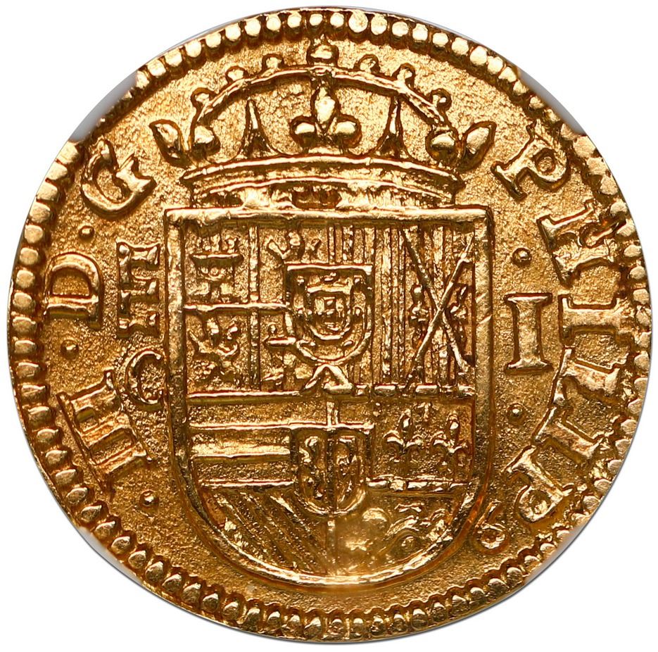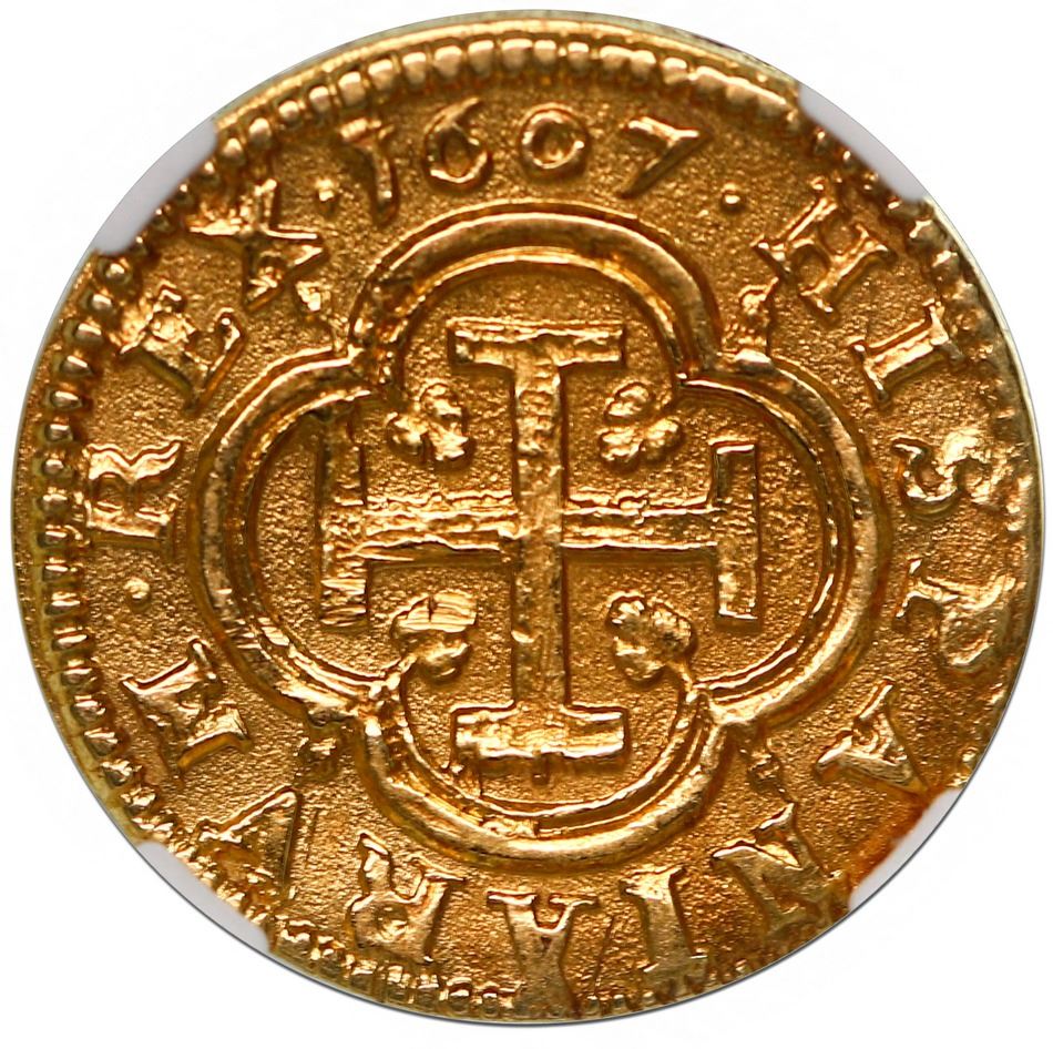 Segovia, Spain, gold milled 1 escudo, Philip III, 1607 C, king's name as PHILIP, NGC MS 65. Cal-1015; KM-29. Scarce and desirable first milled gold of Spain (second variety with 9-shaped ornament after abbreviated king's name), with razor-sharp and pristine details, muted luster on unblemished fields, second highest grade in NGC census behind a pair of MS 66's.