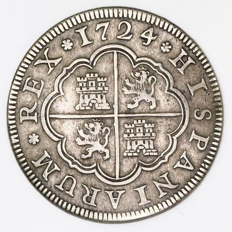 Segovia, Spain, milled 2 reales "pistareen," Louis I, 1724F. CT-41; KM-297. 5.35 grams. Choice XF+ with slight waviness from manufacture, dull gunmetal grey toning.
