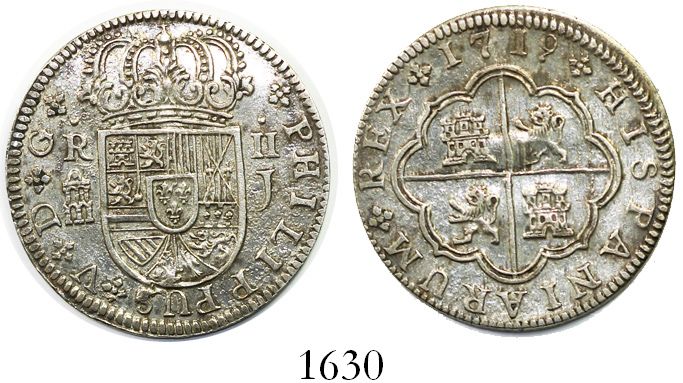 Segovia, Spain, milled 2 reales "pistareen," Philip V, 1719J KM-296; CT-1395. 5.88 grams. Lustrous AU- with strong stress lines on reverse, the obverse surface slightly rough from rusty die, faint toning.