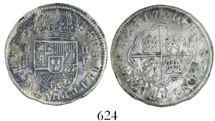 Segovia, Spain, milled 2 reales  pistareen,  Philip V, 1721F, rare type from this wreck.