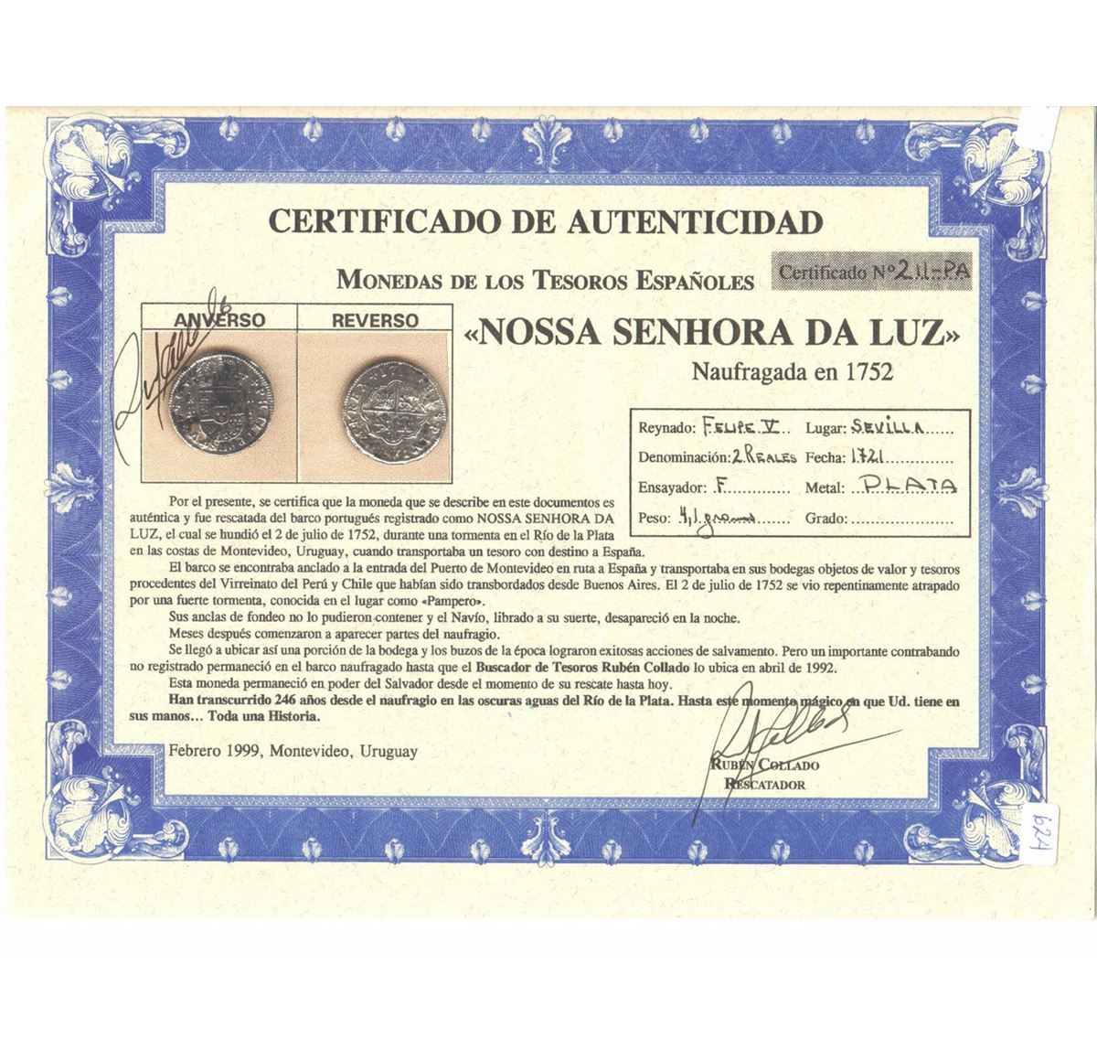 Segovia, Spain, milled 2 reales "pistareen," Philip V, 1721F, rare type from this wreck. KM-297; CT-1399. 4.07 grams. Near-AU details but with light surface corrosion, patchy (uneven) toning. With Collado photo-certificate #211-PA. Recovered from: Luz, sunk in 1752 off Montevideo, Uruguay