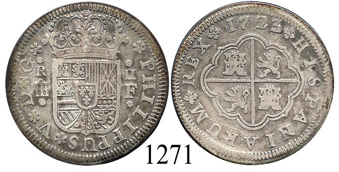 Segovia, Spain, milled 2 reales "pistareen," Philip V, 1723F. CT-1013. 5.7 grams. Broad-flan AVF with much toning (especially on the edge).