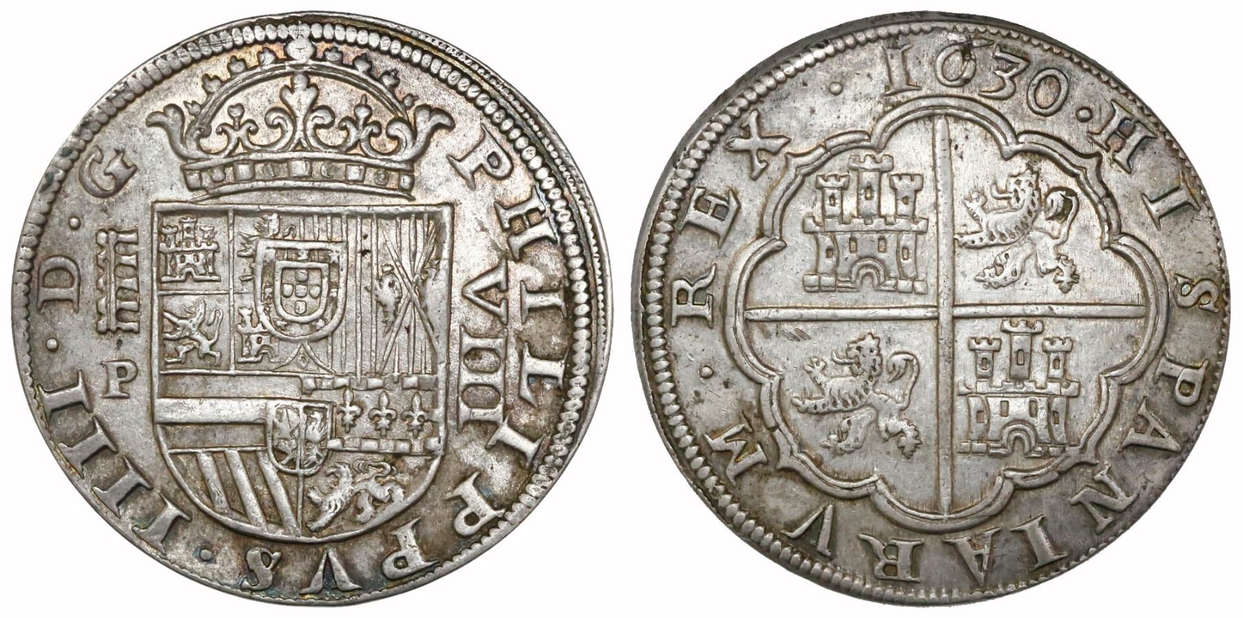 Segovia, Spain, milled 8 reales, Philip IV, 1630P. CT-563; KM-76a . (roller dies- a rodillo) 27.16 grams. AU with red / orange toning over luster around details, slightly off-center strike, mild surface encrustation. Pedigreed to the Ibercoin auction of November 2010, with original lot-tag #388.