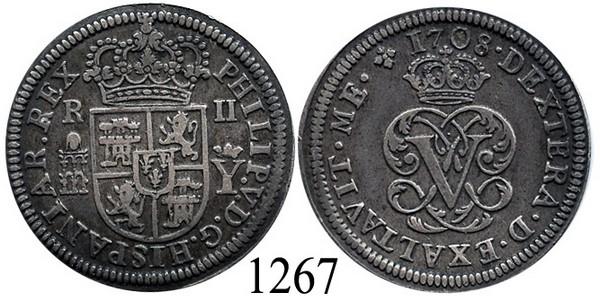 Segovia, Spain, monogram-type milled 2 reales, Philip V, 1708Y, aligned axes.