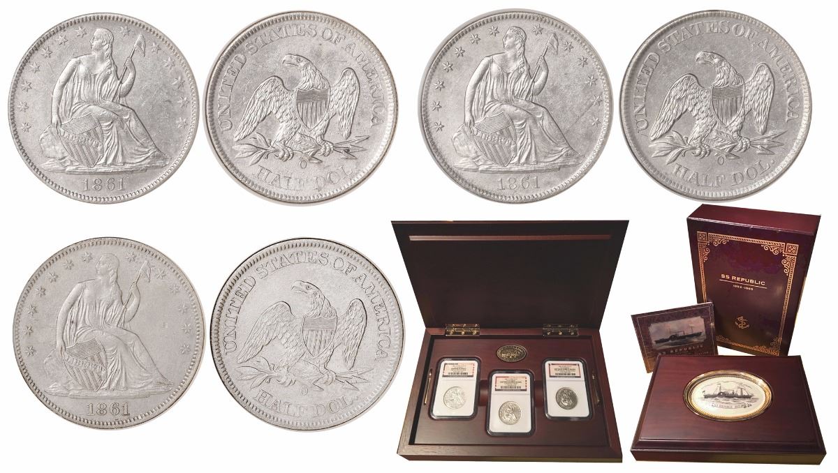 Set of three USA (New Orleans mint) half dollar Seated Liberty, 1861-O, from the SS Republic (1865), encapsulated NGC Shipwreck Effect, representing US issue (rare, W-01A), Louisiana issue (W-07) and Confederate issue (W-13), in promotional case. KM-A68. 10-3/4" x 7-1/4" x 2-1/2" (case). The US issue with light surface corrosion but the other two nearly unaffected (those two labeled as [B] UNC), rare and valuable as a matched date-set due to the US issue (as most sets have an earlier date to represent the US issue) and fascinating as commemorating the secession of Louisiana and its admission to the Confederate States during the Civil War. From the SS Republic (1865), in promotional case with DVD.