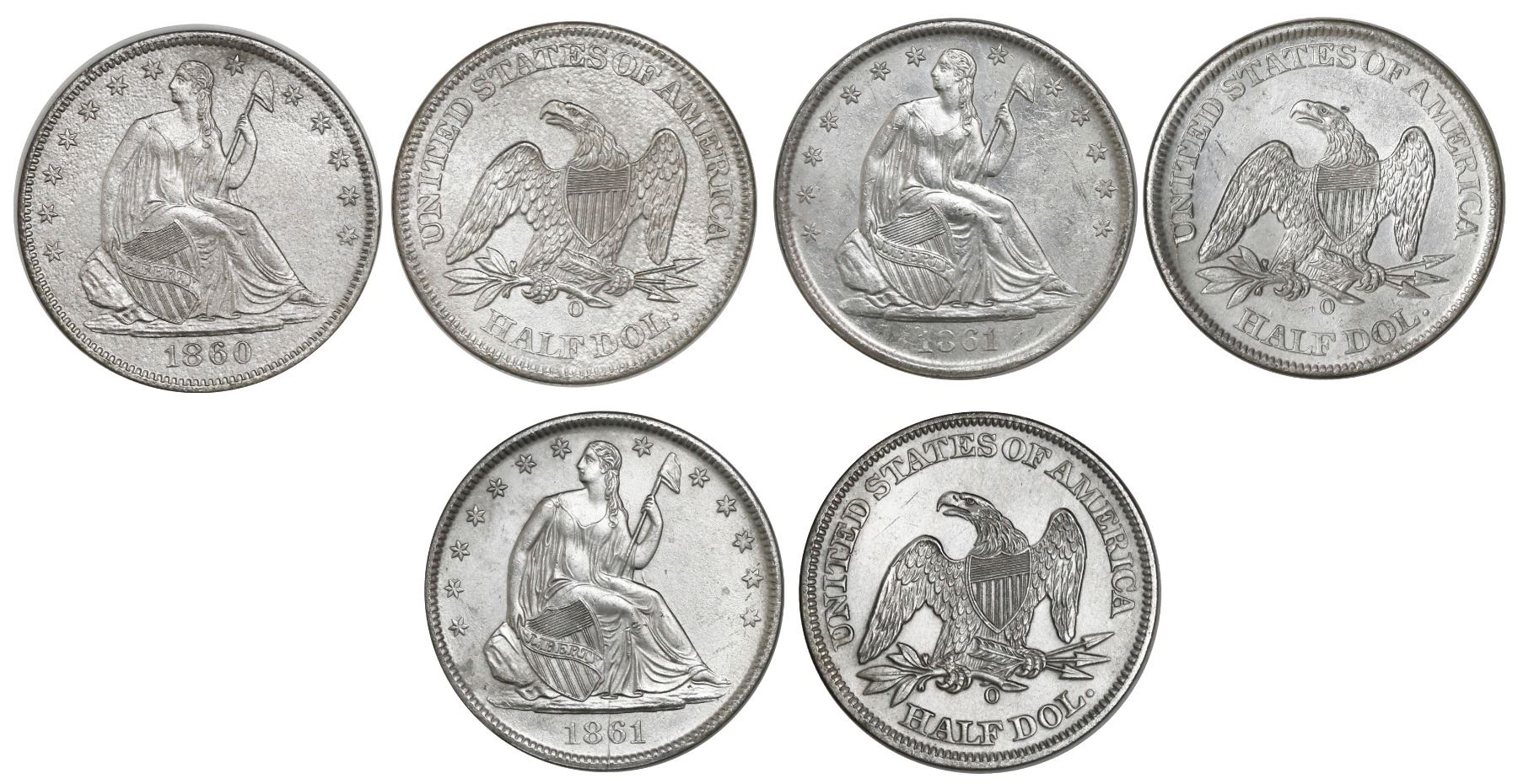 Set of three USA (New Orleans mint) half dollar seated Liberty, 1860-O (United States issue), 1861-O
