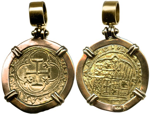 Seville, Spain, 1 escudo, Charles-Joanna, assayer Gothic D to left, mintmark S to right, mounted in 18K bezel. CT-55. 9.1 grams total. Typically sharp and fine details all over, with full shield and cross, much legend, XF or better for grade, simple flat-band bezel with swivel bale.