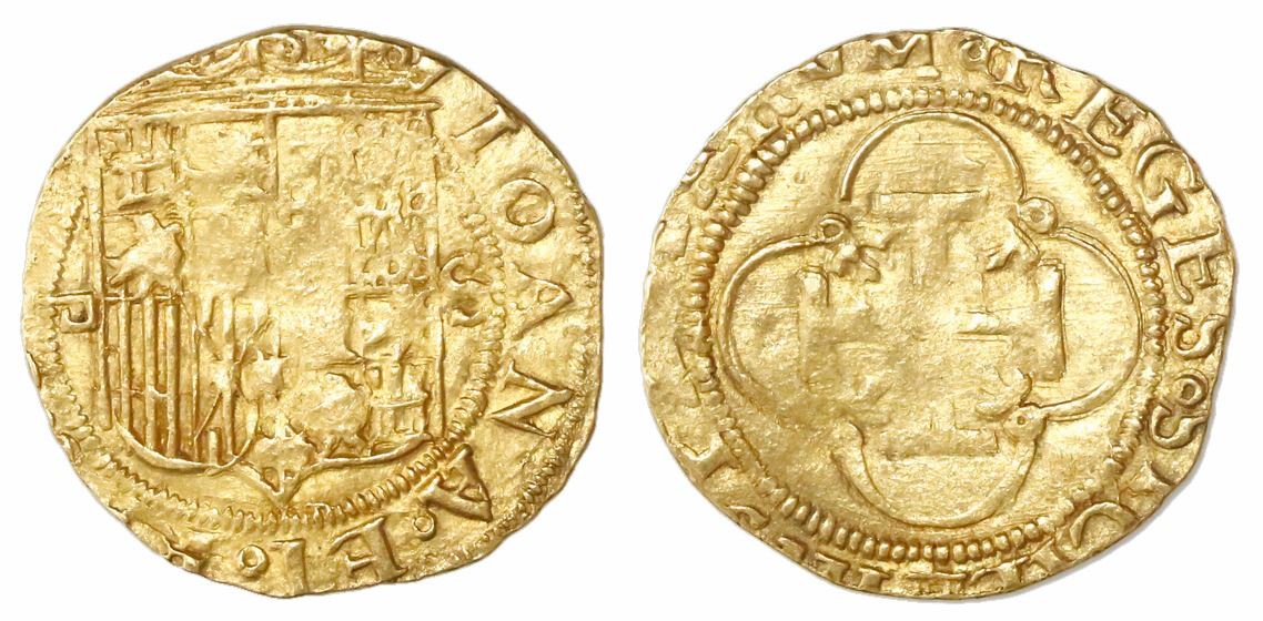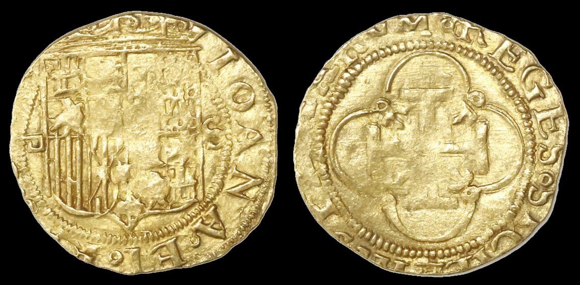 Seville, Spain, 1 escudo, Charles-Joanna, assayer Gothic D to left, mintmark S to right. CT-55. 3.27 grams. Full but centrally flat shield and cross, much legend including full IOANA, AU-.