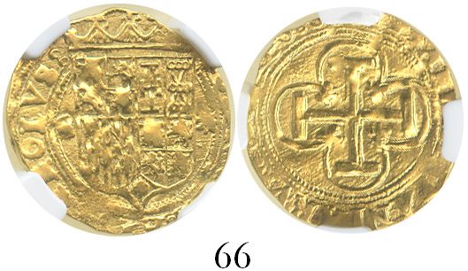 Seville, Spain, 1 escudo, Charles-Joanna, assayer * to right, mintmark S to left, encapsulated NGC AU 53. CT-57. Typically full and well-detailed shield and cross, hint of luster.