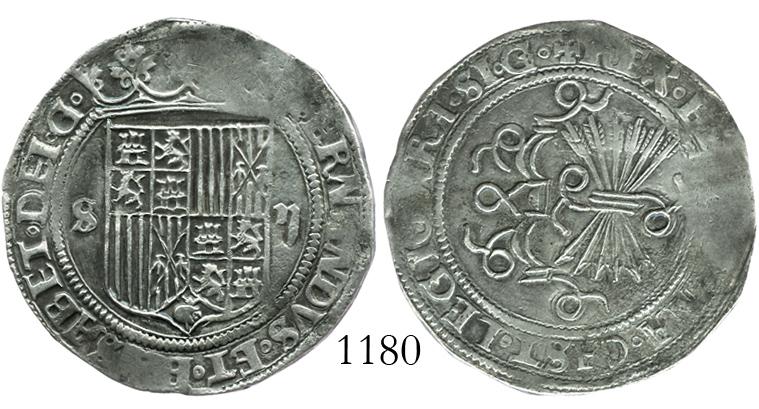 Seville, Spain, 2 reales, Ferdinand-Isabel, no assayer. 6.8 grams. Possible candidate for the world's largest 2 reales at a whopping 32 mm (bigger than most 4R), with choice full shield and side-by-side yoke and arrows, bold S to left and denomination to right of shield, much bold legend (Latin letters), some flat spots but otherwise AXF with contrasting toning. With the 2nd quarter 1992 issue of PLVS VLTRA newsletter, in which this coin was featured and pictured.