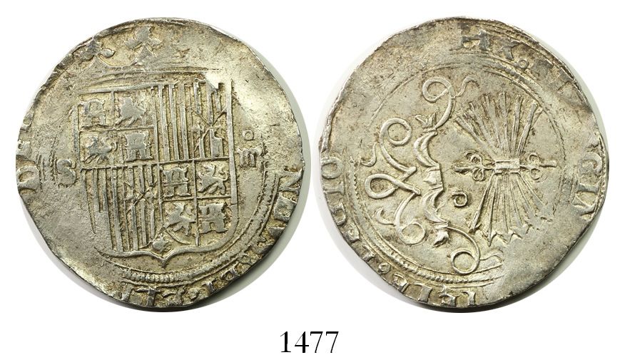 Seville, Spain, 4 reales, Ferdinand-Isabel, assayer Gothic D between yoke and arrows on reverse. CT-unl. 13.66 grams. Broad flan with limited legends (flat spots) but typically sharp and full inner details, AXF with hint of luster, no toning, common assayer but unlisted for its location.