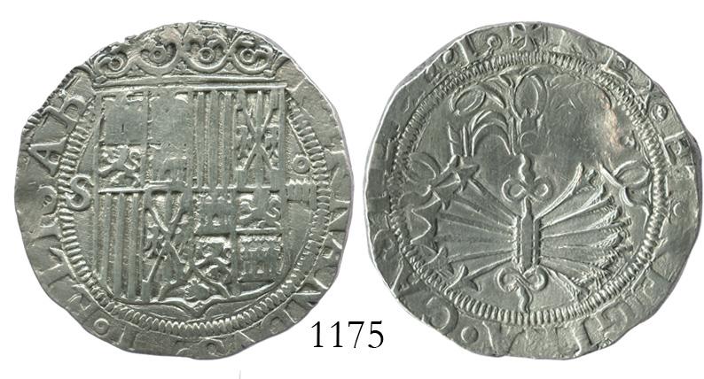 Seville, Spain, 4 reales, Ferdinand-Isabel, assayer Gothic D. 13.5 grams. Bold later style with all inner details full, also nearly full legends and crown, bold S to left and denomination to right, weak assayer to right of yoke above arrows, non-toned VF.