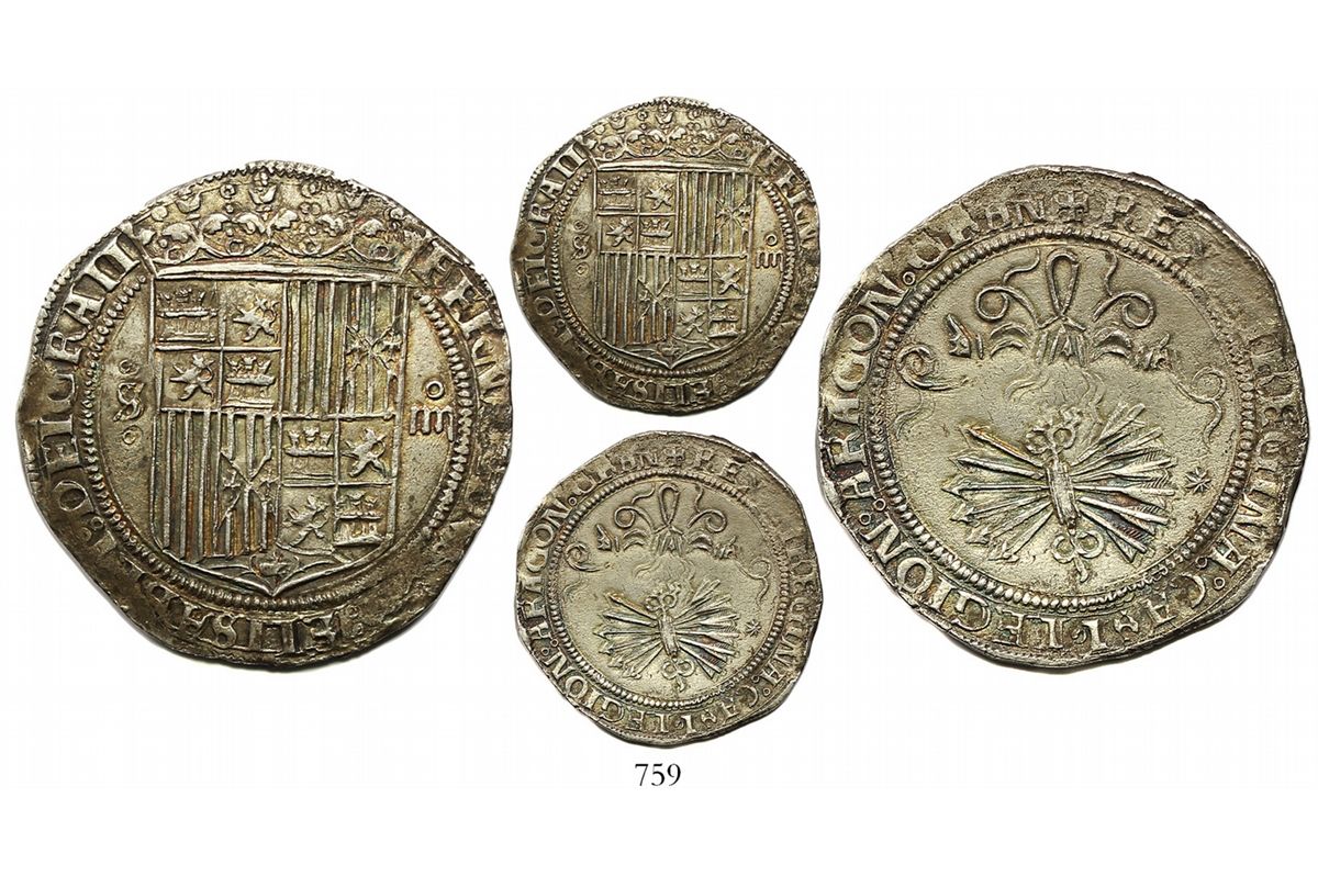 Seville, Spain, 4 reales, Ferdinand-Isabel, assayer * to right of arrows, mintmark S to left of shield, rare variety with GRAN (Granada) in legend, Pellicer i Bru Plate Coin. CT-unl (Type 188). 13.23 grams. Choice, broad-flan specimen with all legends and inner details full and well struck, XF+ with lovely old toning all over, important pedigree. Note: The planchet for this is not broad simply by caprice or whim; rather it is intentionally broad, for the engraver at the time stuffed the die with more legend lettering than on any other, in any denomination. The difference is the listing of the regions encompassed by the king and queen's joint rule, which in full would read CASTEL (Castile) LEGIONIS (Leon) ARAGON GRANADA. Even the largest 8R do not show all of these names and typically stop before Aragon, with significant abbreviations along the way. Plate Coin #26 in Pellicer i Bru's El Medio Duro (1971).