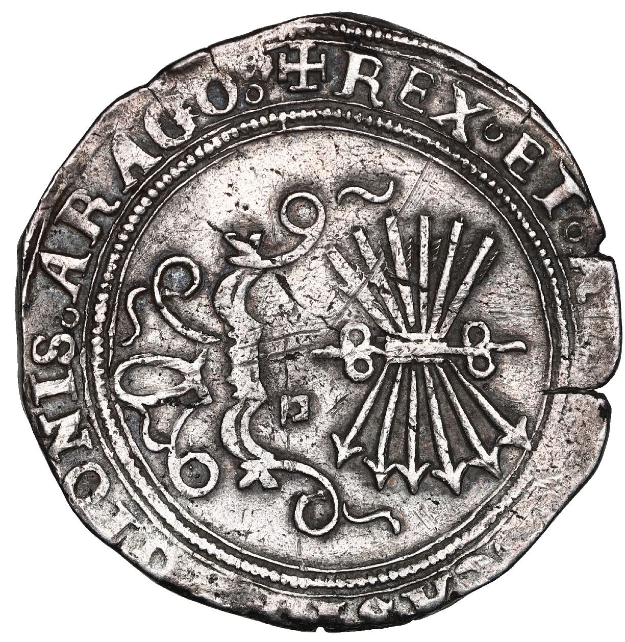 Seville, Spain, 4 reales, Ferdinand-Isabel, mintmark S to left, denomination o-iiii to right, assayer Gothic D on reverse, legends ending in DoGo and ARAGOo. Lopez de la Fuente-unl (cf H5.6.11); Cal-564. 13.61 grams. Well-struck XF with choice toning, full crown and most of legends (the variety very clear), two tiny edge-splits.
