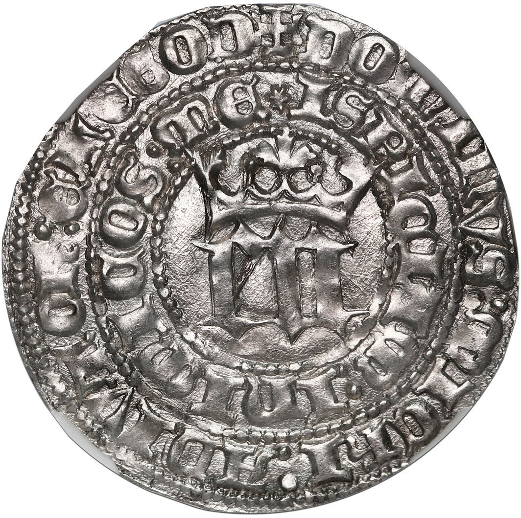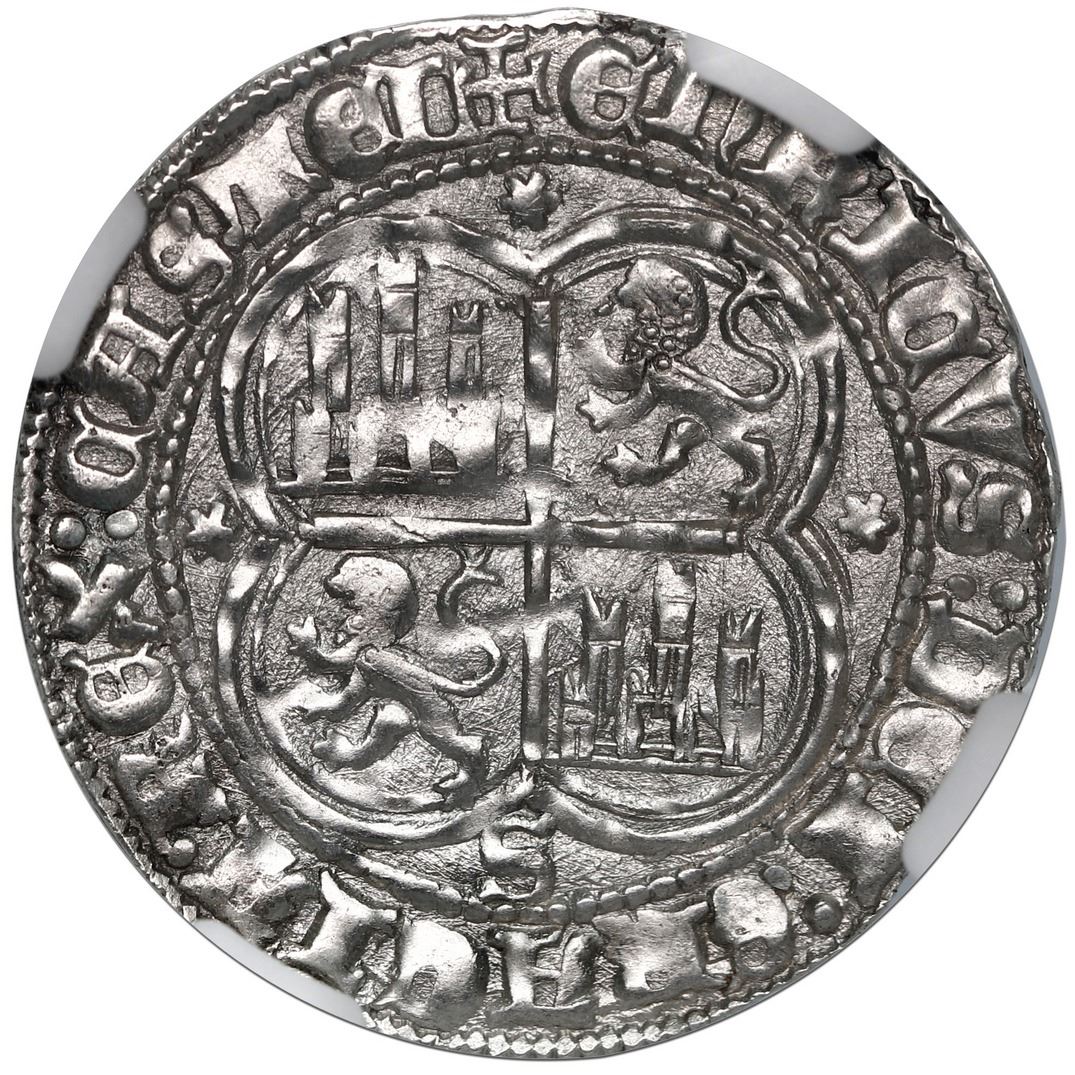Seville, Spain (Castile and Leon), 1 real, Enrique III (1390-1406), S and three stars around cross, NGC MS 64. Cay-1489. 3.46 grams. Broad flan with bold full details, bright white as nearly pristine and non-toned.