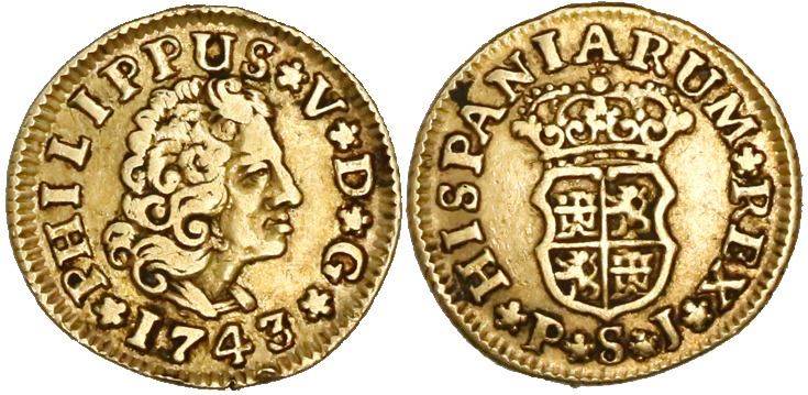 Seville, Spain, bust 1/2 escudo, Philip V, 1743PJ. CT-584; KM-361.2. 1.71 grams. VF, sediment around lettering.