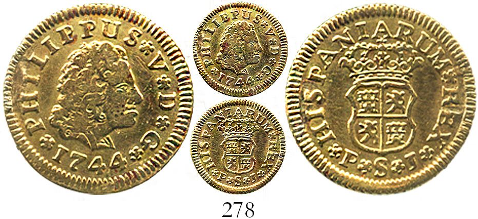 Seville, Spain, bust 1/2 escudo, Philip V, 1744PJ. CT-587; KM-361.2. 1.7 grams. Bold, lustrous XF with minor damage on rims.