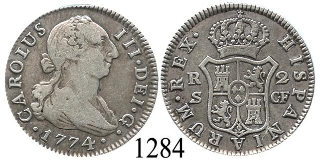 Seville, Spain, bust 2 reales, Charles III, 1774CF.