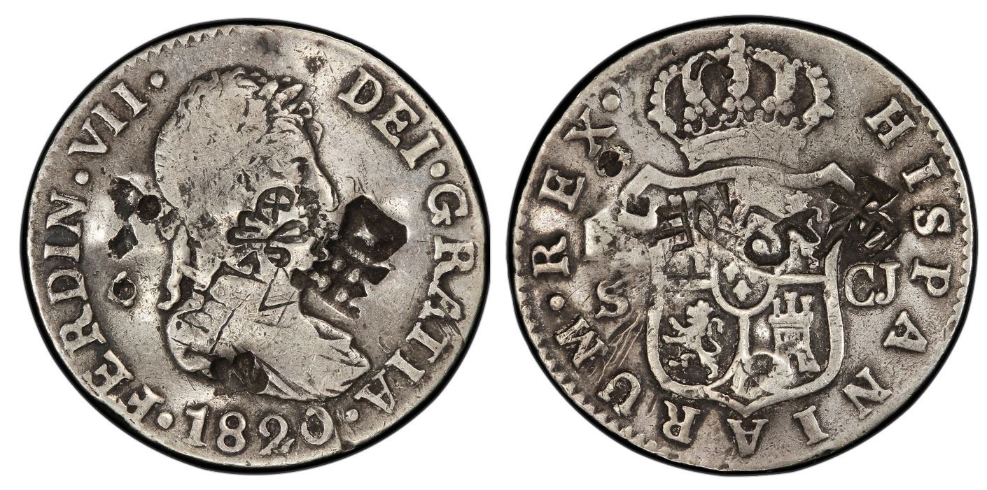 Seville, Spain, bust 2 reales, Ferdinand VII, 1820CJ, with chopmarks as from circulation in Asia, PCGS genuine / chopmark. Host: KM-460.3; Cal-952. Toned Fine host with full details, several (mostly deep) chopmarks in centers on both sides plus punch-marks for testing the silver in field behind head. PCGS #29484937.