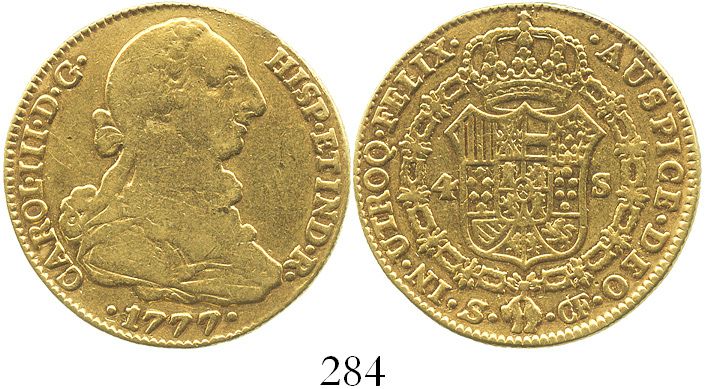 Seville, Spain, bust 4 escudos, Charles III, 1777CF. CT-403; KM-418.2. 13.2 grams. Lightly polished VF/XF, good strike.