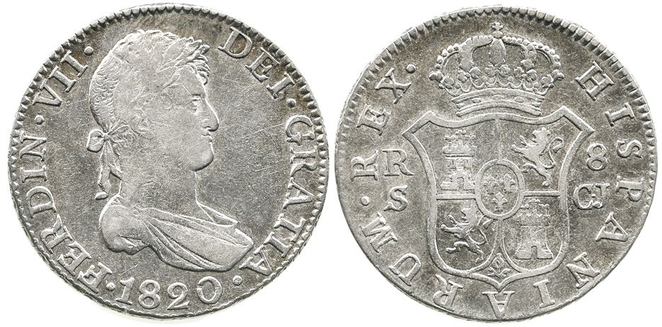Seville, Spain, bust 8 reales, Ferdinand VII, 1820CJ.