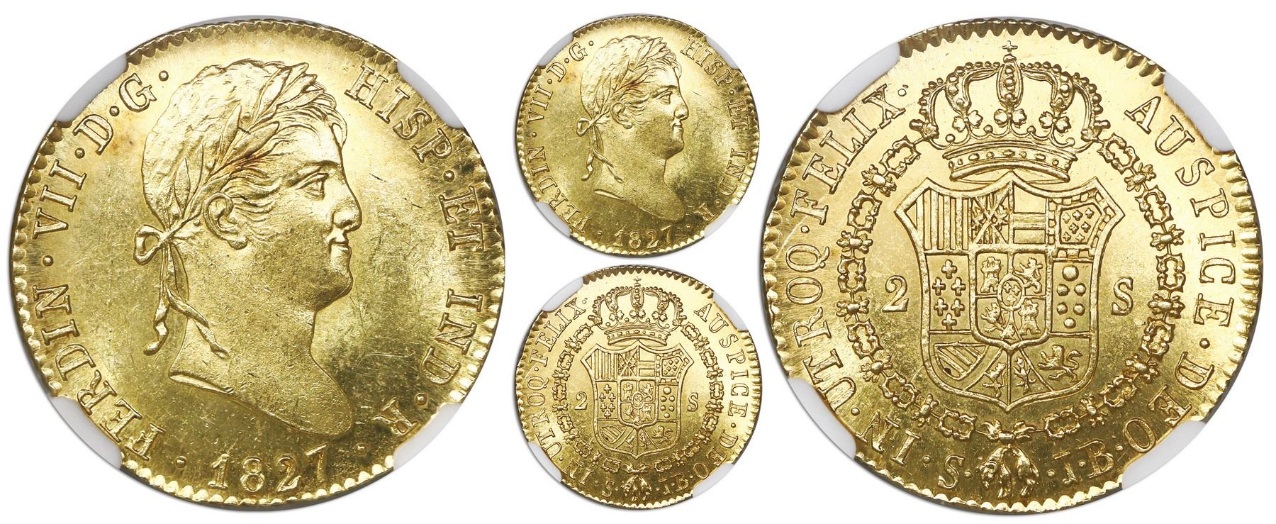 Seville, Spain, bust gold 2 escudos, Ferdinand VII, 1827JB, NGC MS64+, finest known in NGC census. ,CT-271; KM-483.2. Superb strike and intense luster, practically flawless. NGC #2802548-012.