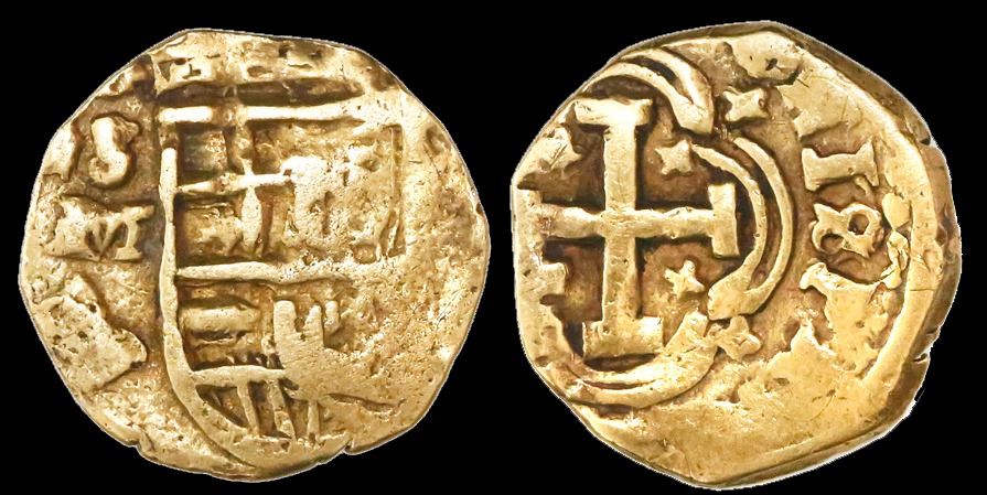 Seville, Spain, cob 1 escudo, Charles II, assayer M, rare. CT-Type 55; KM-214. 3.24 grams. Bold full assayer-mintmark S-M to left of nearly full shield, good but off-center cross with possible final digit 8/7 of date in legend, XF with toned fields.