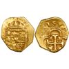 Seville, Spain, cob 1 escudo, Philip III, assayer not visible. CT-Type 29. 2.66 grams. Choice full shield and crown, full and bold but off-center cross, nicely toned XF, light edge-clip.
