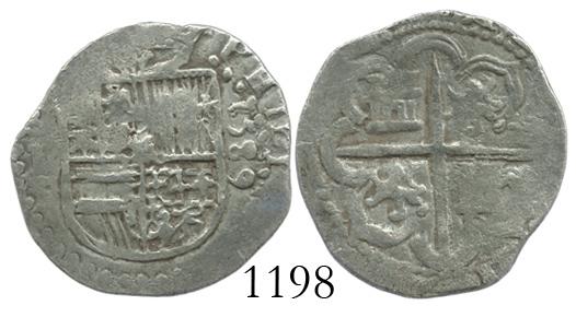Seville, Spain, cob 1 real, 1589, assayer Gothic D. CT-669. 3.3 grams. Nice full shield with bold date (vertically) to right, very weak S-I-Gothic P to left, also full cross but some weak spots, AVF with dark-orange sediment in crevices.