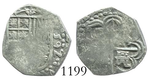 Seville, Spain, cob 1 real, 1592(B). CT-672. 3.4 grams. Bold date, nice upper-left quadrant of shield and lower-right quadrant (castle) of cross, also fleur below crown, but all the rest flat due to uneven flan, otherwise VF+ and attractively toned.