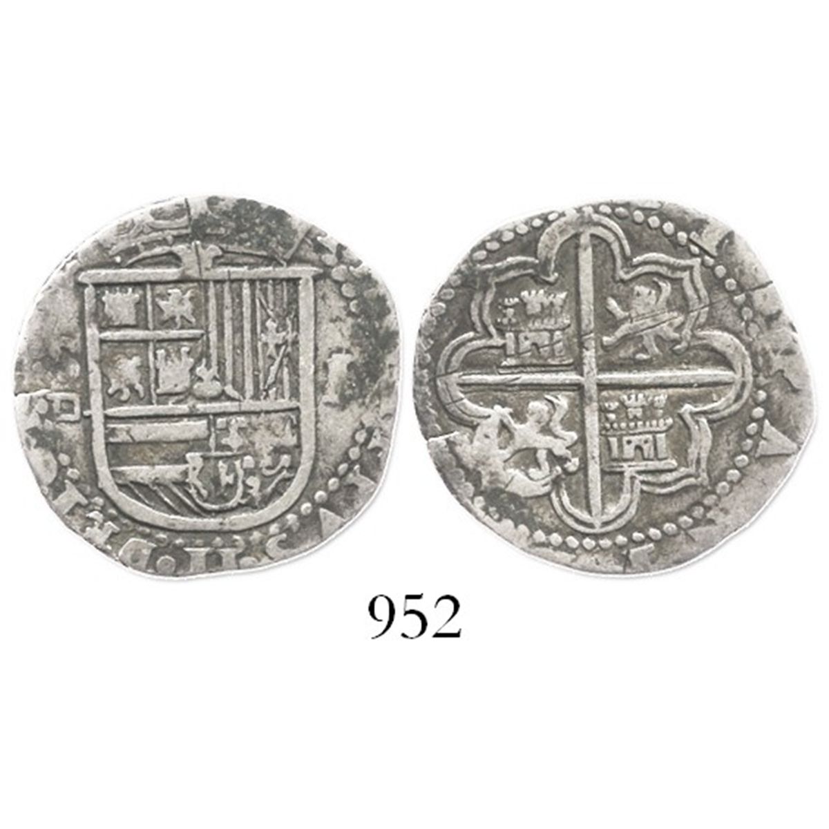 Seville, Spain, cob 1 real, Philip II, assayer Gothic D below mintmark to left.