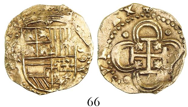 Seville, Spain, cob 2 escudos, Philip II, (1)591/0 date vertically to right, assayer H to left.