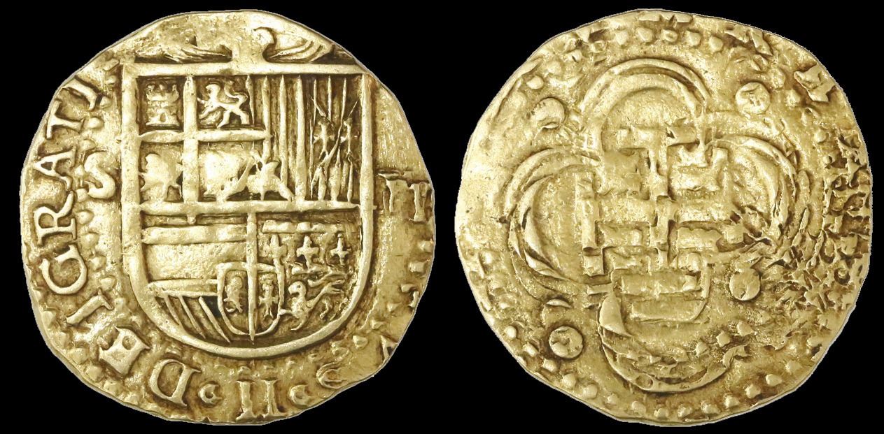 Seville, Spain, cob 2 escudos, Philip II, assayer not visible. 6.71 grams. Choice full shield and bold obverse legend (full king's ordinal II and DEI GRATIA), full but weaker and very double-struck cross, XF+ with contrasting toning around details.