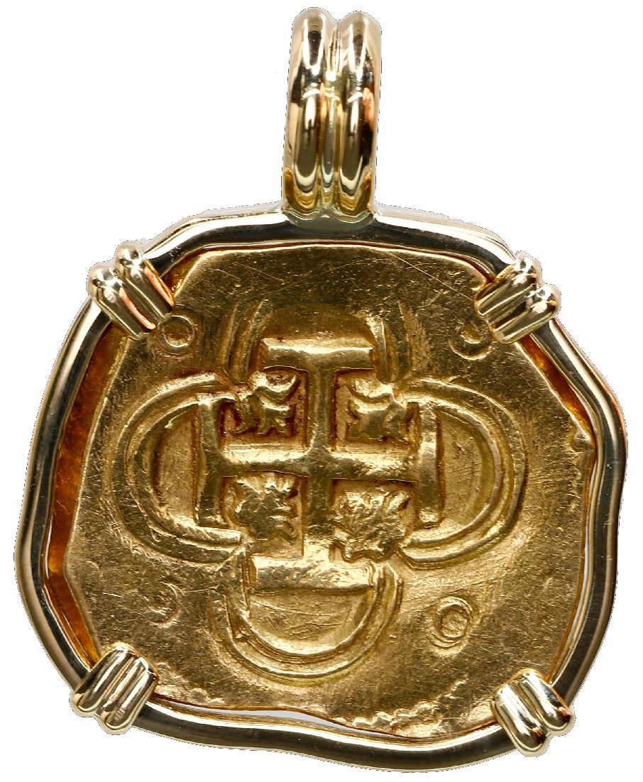 Seville, Spain, cob 2 escudos, Philip II or III, assayer B, mounted cross-side out in 18K gold bezel with fixed bail. 9.78 grams total. Choice full cross, good full shield with bold assayer B to left and denomination II to right, AU with peripheral flatness, well mounted in low-gauge wire with squared sides.