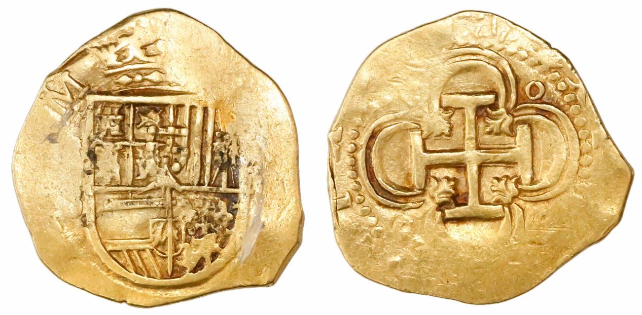 Seville, Spain, cob 2 escudos, Philip III, assayer B. CT-Type 19; KM-20. 6.73 grams. Nice full shield and cross, weak S-B, AU with flat peripheries.