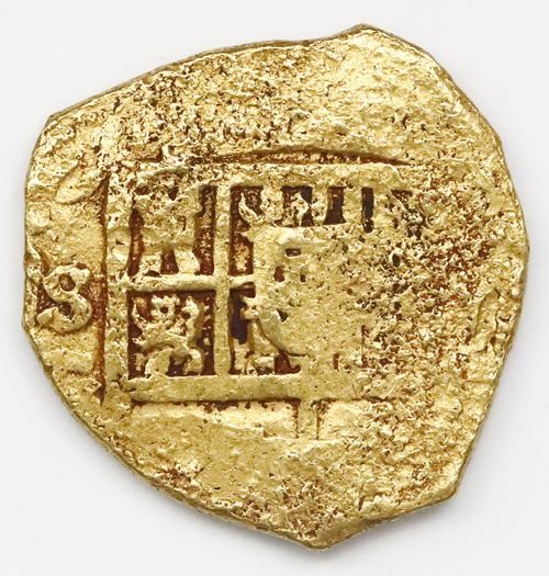 Seville, Spain, cob 2 escudos, Philip III, assayer G. CT-Type 22; KM-20. 6.77 grams. XF/AU, struck with rusty dies on a small but thick planchet, dark toning in recessed areas, previously mounted.