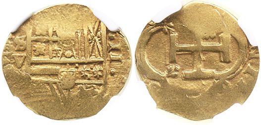 Seville, Spain, cob 2 escudos, Philip III, assayer V, encapsulated NGC XF 40. KM-48.3; CT-Type 21. Oval flan with bold S-V and denomination II flanking a nearly full shield, the cross nearly full but partially flat, attractively red-toned and accurately graded in our opinion.