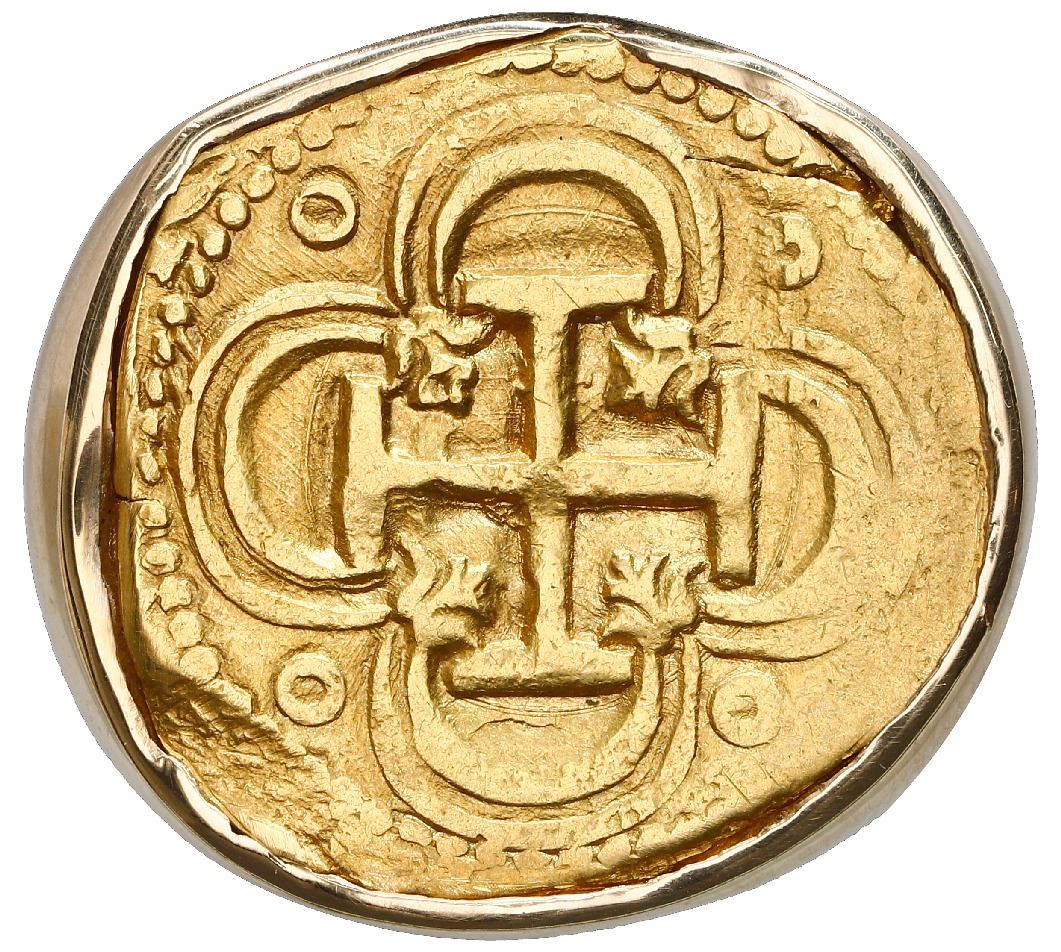Seville, Spain, cob 2 escudos, Philip III, assayer not visible, mounted cross-side out in 18K gold ring (size 9-1/2). 18.12 grams total. Sturdy, unadorned ring with open back so you can see both sides of the coin, which displays a choice full cross (top) and shield (inside the ring) in AU grade, also with denomination II visible.