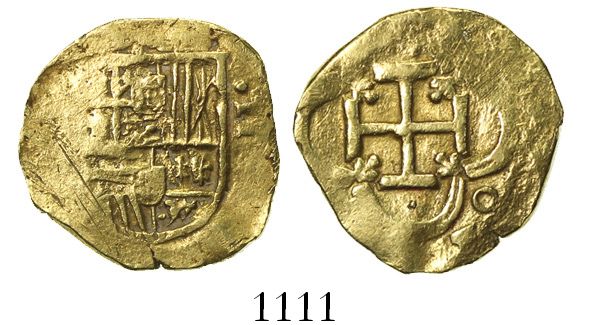 Seville, Spain, cob 2 escudos, Philip III (?), assayer not visible. 5.86 grams. Good full cross and shield with encrustation in crevices, old scratches, inexplicably underweight.