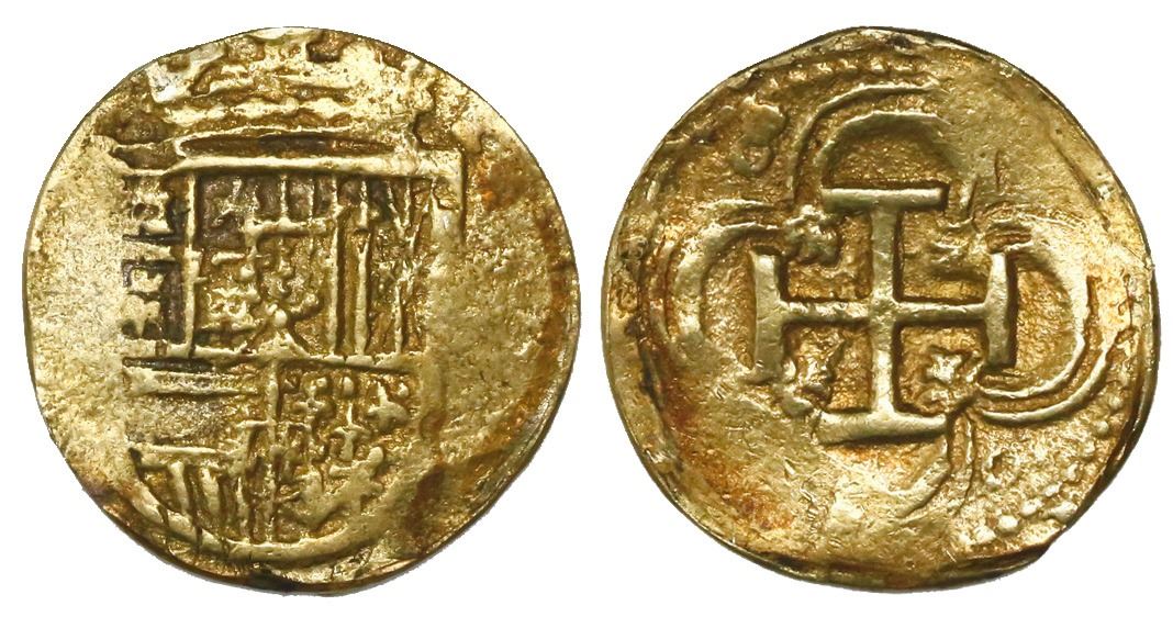 Seville, Spain, cob 2 escudos, Philip III, assayer not visible. 5.93 grams. Choice full cross and shield, XF details with red toning, edge rounded and trimmed for former mounting.