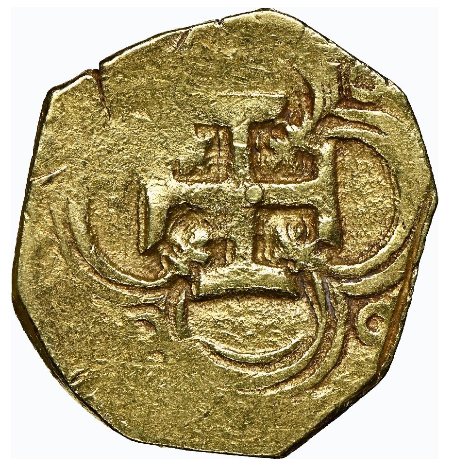 Seville, Spain, cob 2 escudos, Philip IV, assayer D, NGC AU 55. Cal-Type 388; KM-82.1. 6.73 grams. Nearly full shield and cross, clear assayer and bold king's ordinal IIII despite some peripheral flatness, lightly toned in crevices. NGC #5961961-005.