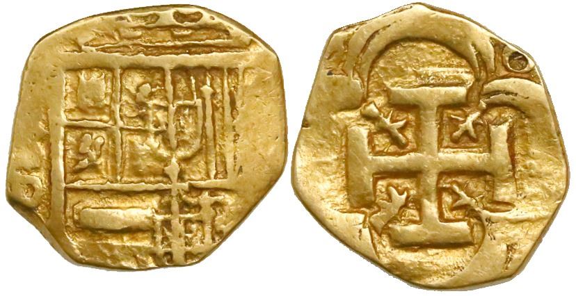 Seville, Spain, cob 2 escudos (cut down to 1E size), Philip IV, assayer D. CT-Type 46. 4.86 grams. Good full cross and nearly full shield, both identifiable as 2E size but also with clipped edges, toned XF.