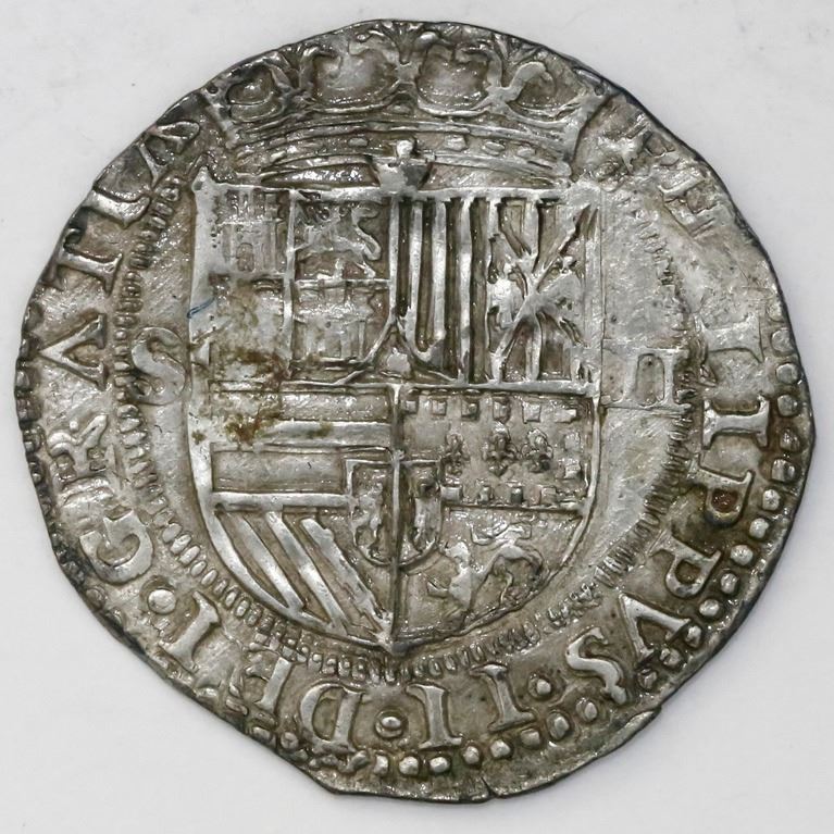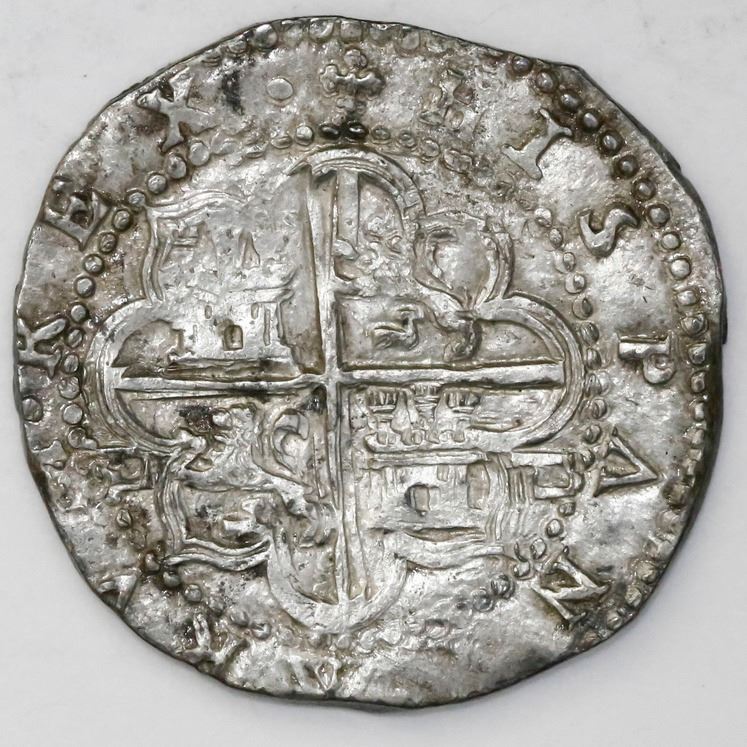 Seville, Spain, cob 2 reales, Philip II, assayer Gothic D at 4 and 8 o'clock on reverse.