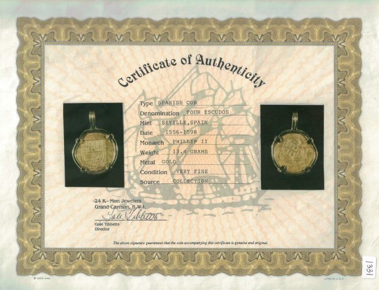 Seville, Spain, cob 4 escudos, Philip II, assayer Gothic D with open right side below mintmark S to left, mounted in 18K bezel with shackle bail and ten cabochon emeralds. 21.53 grams total. Broad-flan XF for grade, with choice full cross and shield, bold full mintmark-assayer, sturdy mounting with emeralds on both sides of coin and bail.
