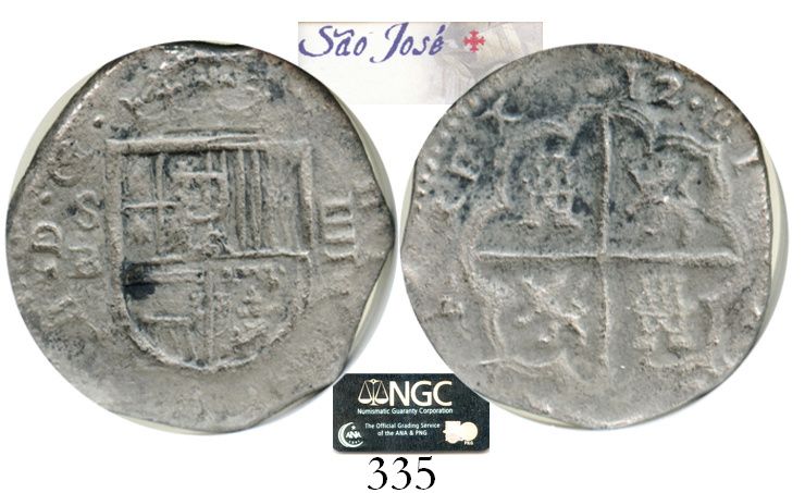 Seville, Spain, cob 4 reales, 1612B, Grade 1. CT-268. Broad flan with small (2R-sized?) shield flanked by clear S-B and IIII, good full cross-and-tressure with bold date above, light toning and surface corrosion. Encapsulated by NGC and with Arqueonautas certificate #1974055003, with wooden presentation box. From the Sao Jose, sunk in 1622 off Mozambique, east of Africa