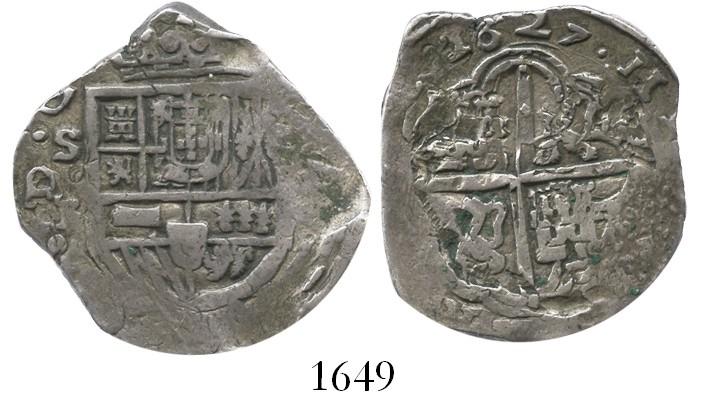 Seville, Spain, cob 4 reales, 1627R. KM-132.5; CT-803. 13.6 grams. Bold full date and mintmark, full shield and cross and most of crown, crude edge (as made), lightly toned VF.