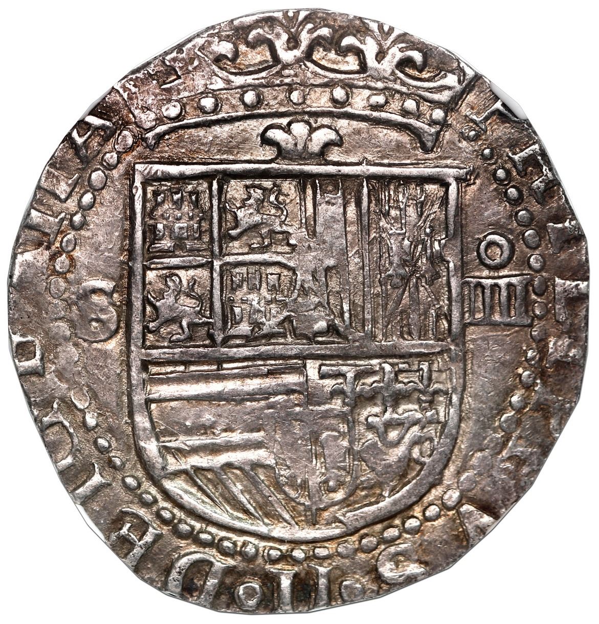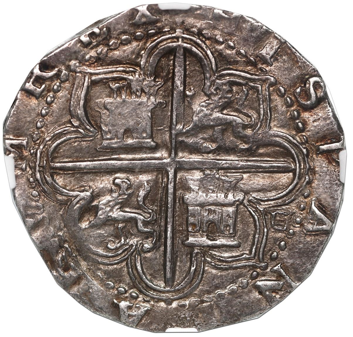 Seville, Spain, cob 4 reales, Philip II, fleur above shield, assayer Gothic D at four o'clock outsid