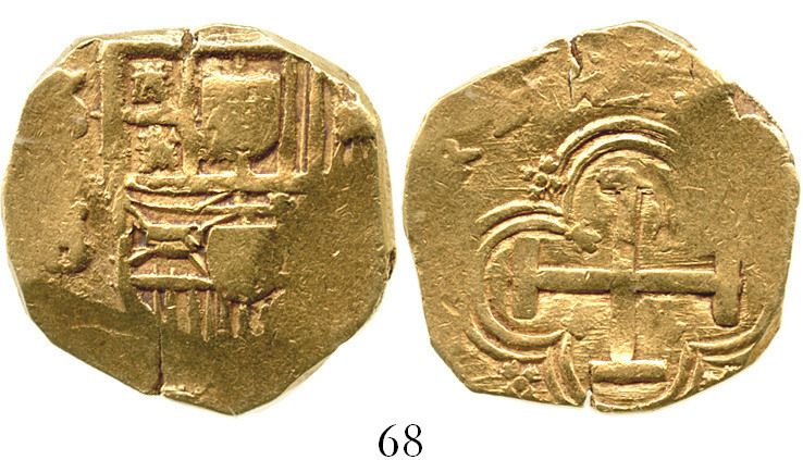Seville, Spain, cob 8 escudos, Charles II, assayer S (1670s-1680s). KM-168.2. 27.0 grams. Typically crude (much flatness) but with nearly full shield and cross-and-tressure, clear S-S to left, AXF with hairline edge-split.