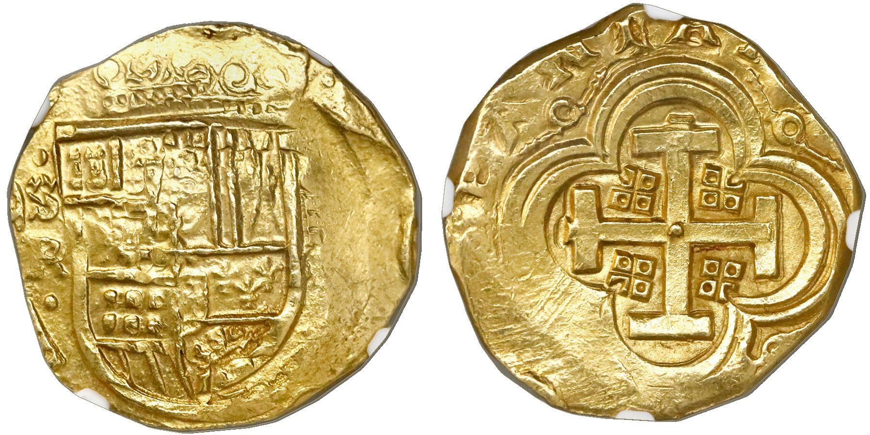 Seville, Spain, cob 8 escudos, Philip IV, assayer R, NGC MS 63. CT-Type 15; KM-112. 26.84 grams. Brightly lustrous (unusual for this type), with superb full cross-and-tressure, double-struck full shield, full mintmark-assayer, part of edge crude (as made). NGC #4485344-002.